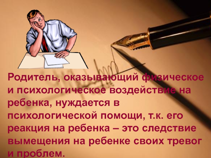 Слайд 16Родитель, оказывающий физическое и психологическое воздействие на ребенка, нуждается в психологической