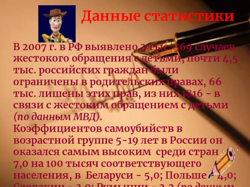 В 2007 г. в РФ выявлено 3 тыс. 569 случаев жестокого обращения с детьми, почти 4,5 тыс. российских граждан были ограничены в родительских правах, 66 тыс. лишены этих прав, из них 1816 - в связи с жестоким обращением с детьми (по данным МВД).
