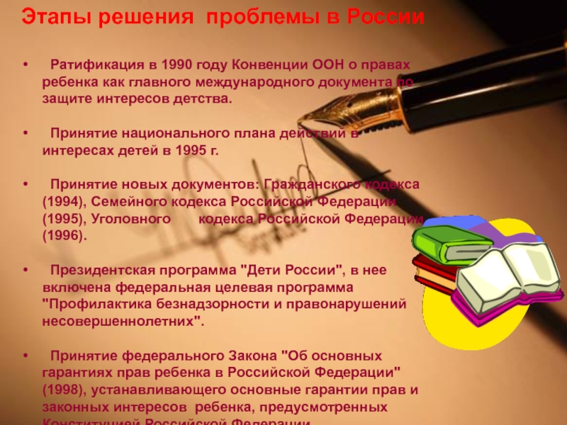 Принятие федерального Закона "Об основных гарантиях прав ребенка в Российской Федерации" (1998), устанавливающего основные гарантии прав и законных интересов ребенка, предусмотренных Конституцией Российской Федерации.