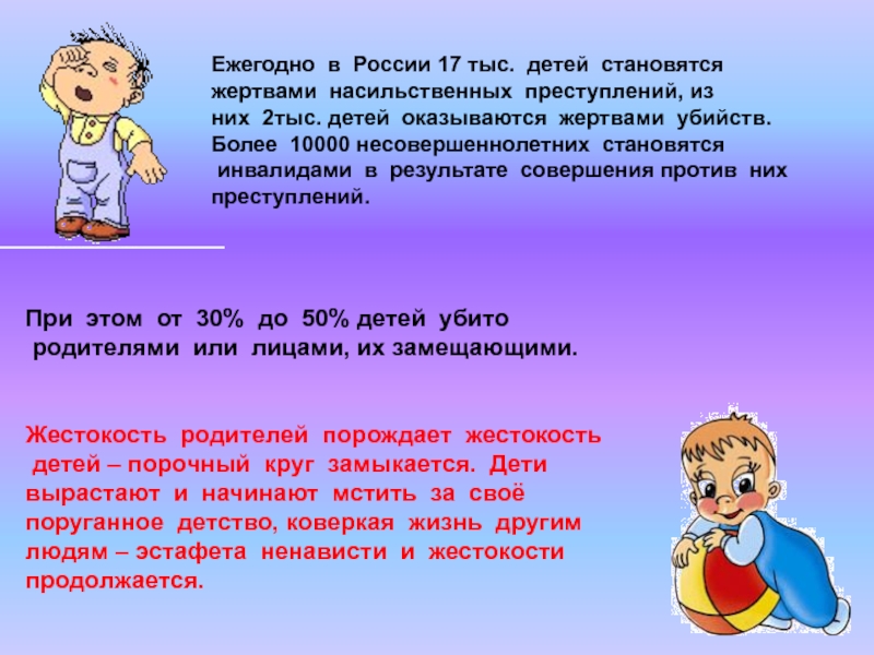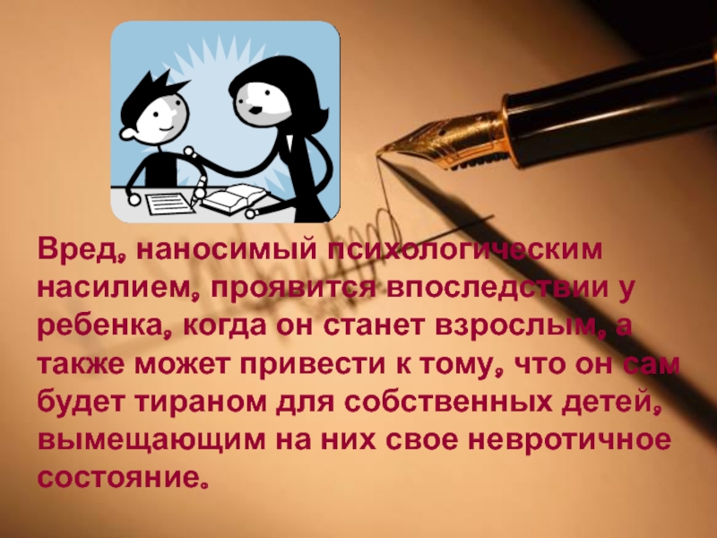 Слайд 20Вред, наносимый психологическим насилием, проявится впоследствии у ребенка, когда он станет