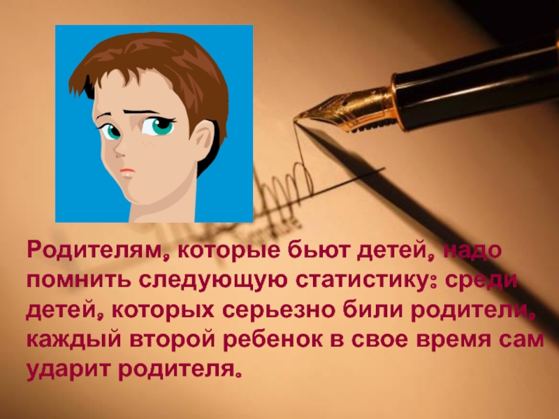Слайд 19Родителям, которые бьют детей, надо помнить следующую статистику: среди детей, которых