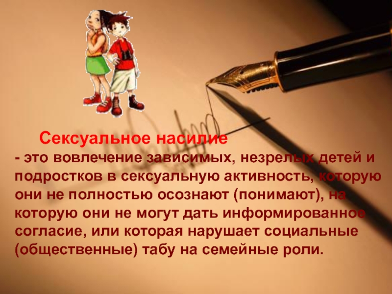 незрелых детей и подростков в сексуальную активность, которую они не полностью осознают (понимают), на которую они не могут дать информированное согласие, или которая нарушает социальные (общественные) табу на семейные роли.