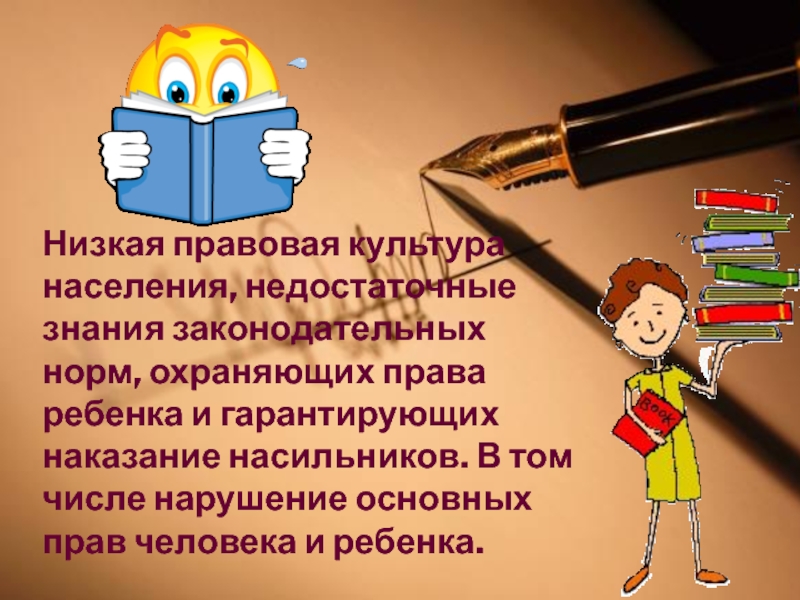 Слайд 15Низкая правовая культура населения, недостаточные знания законодательных норм, охраняющих права ребенка
