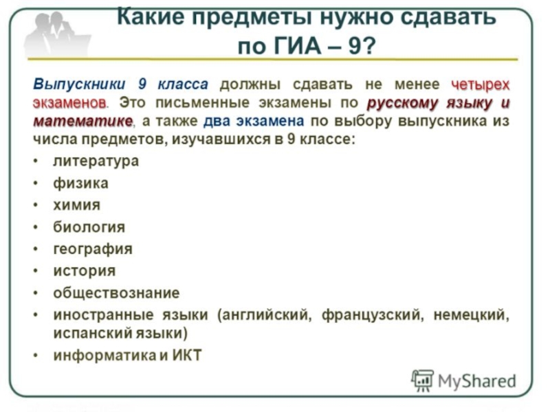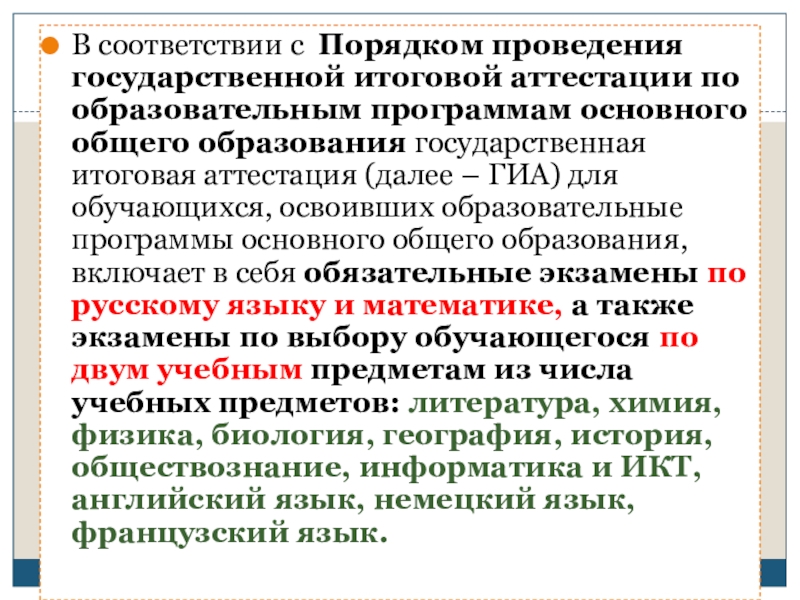 основного общего образования государственная итоговая аттестация (далее – ГИА) для обучающихся, освоивших образовательные программы основного общего образования, включает в себя обязательные экзамены по русскому языку и математике, а также экзамены по выбору обучающегося по двум учебным предметам из числа учебных предметов: литература, химия, физика, биология, география, история, обществознание, информатика и ИКТ, английский язык, немецкий язык, французский язык.