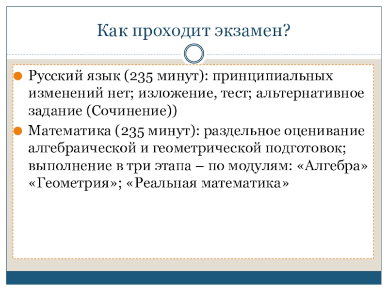 Математика (235 минут): раздельное оценивание алгебраической и геометрической подготовок; выполнение в три этапа – по модулям: «Алгебра» «Геометрия»; «Реальная математика»