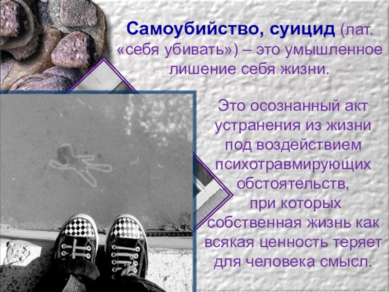 Самоубийство, суицид (лат. «себя убивать») – это умышленное лишение себя жизни.