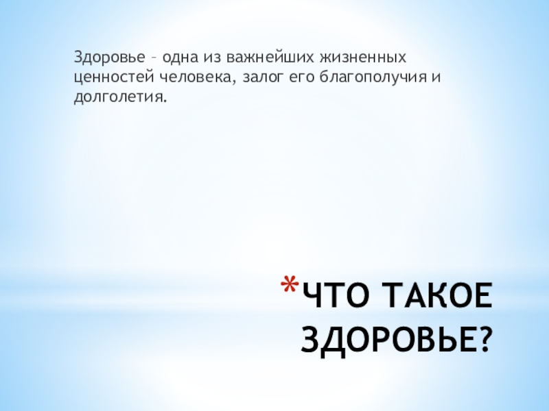 ЧТО ТАКОЕ ЗДОРОВЬЕ?Здоровье – одна из важнейших жизненных ценностей человека, залог его благополучия и долголетия.