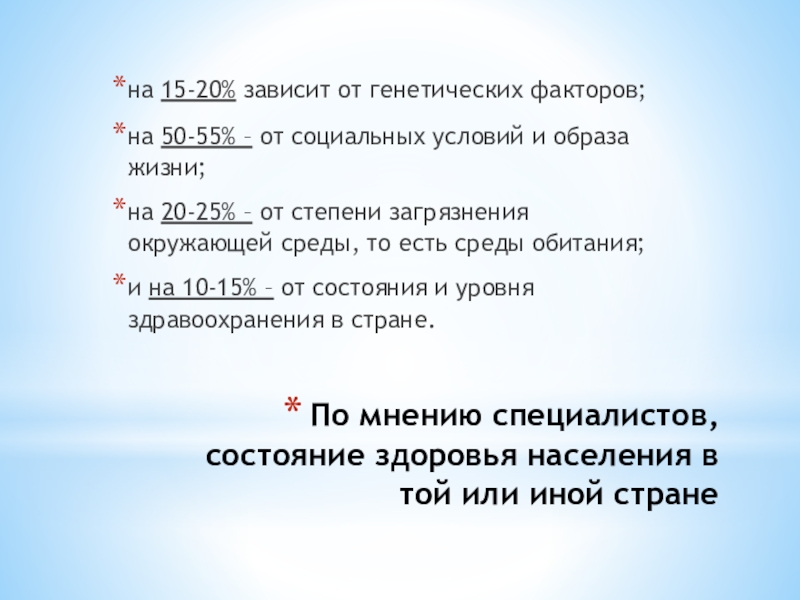 По мнению специалистов, состояние здоровья населения в той или иной странена 15-20% зависит от генетических факторов;на 50-55%