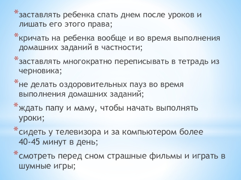 Слайд 11заставлять ребенка спать днем после уроков и лишать его этого права;