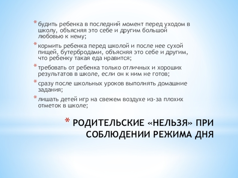 Слайд 10РОДИТЕЛЬСКИЕ «НЕЛЬЗЯ» ПРИ СОБЛЮДЕНИИ РЕЖИМА ДНЯ