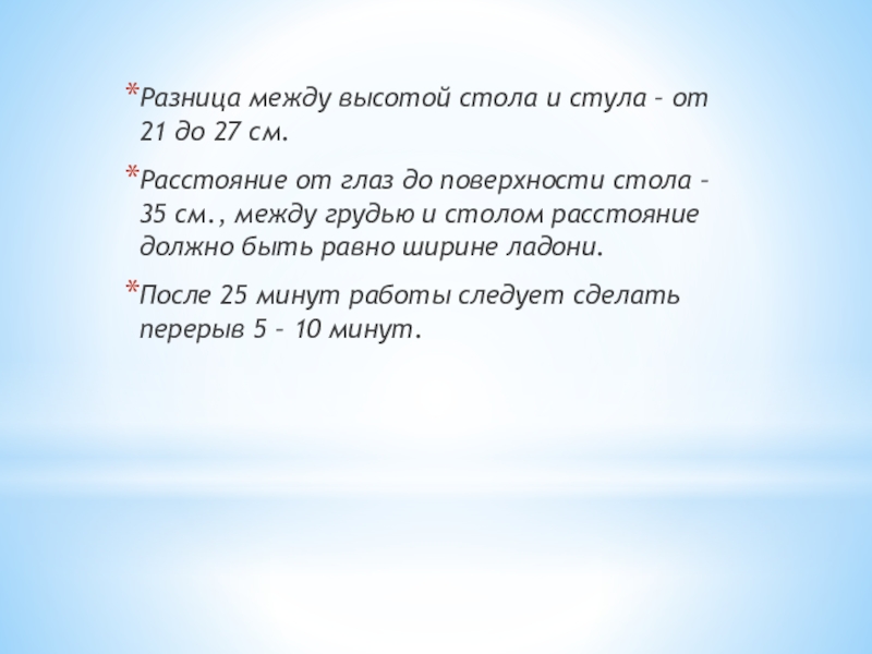 Разница между высотой стола и стула – от 21 до 27 см.Расстояние от глаз до поверхности стола