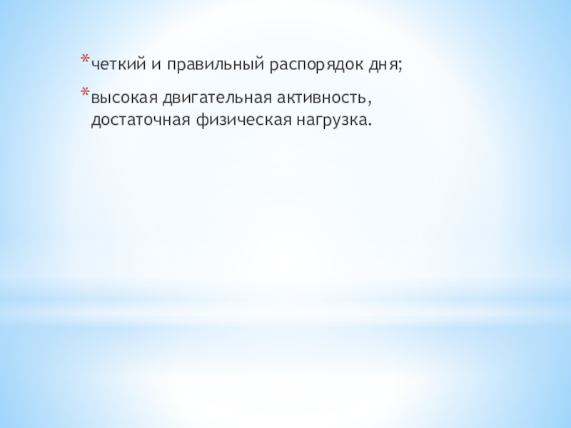 четкий и правильный распорядок дня;высокая двигательная активность, достаточная физическая нагрузка.