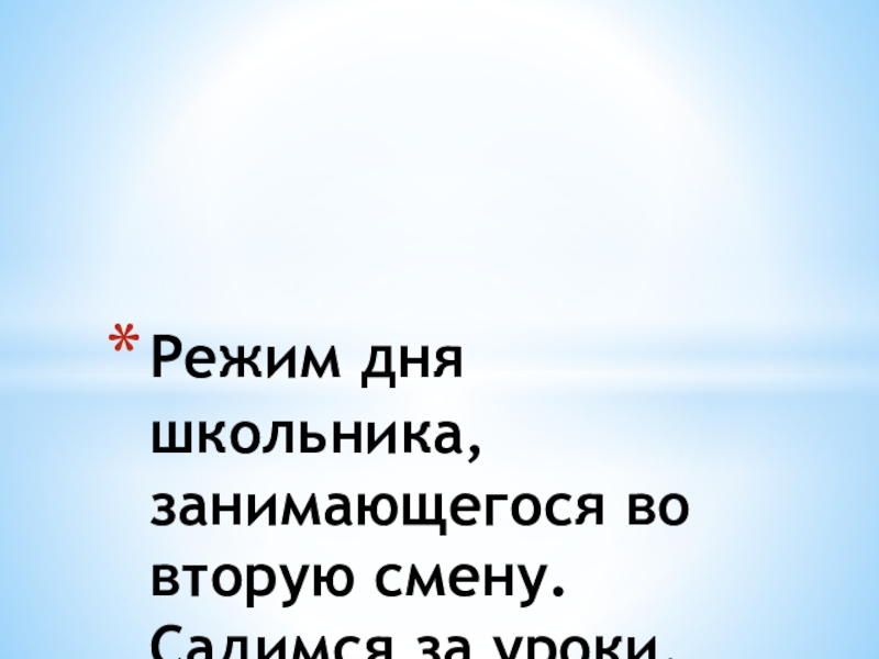 Слайд 1Режим дня школьника, занимающегося во вторую смену. Садимся за уроки.