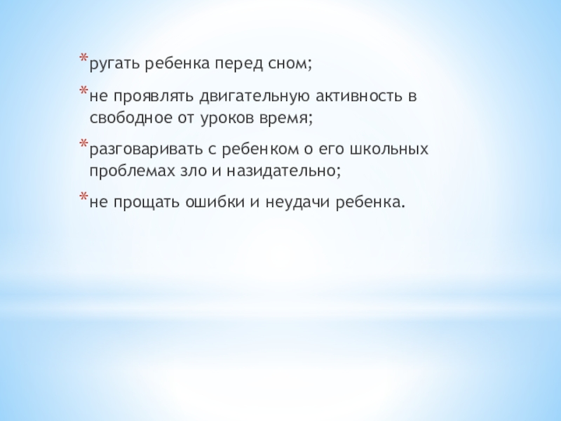 ругать ребенка перед сном;не проявлять двигательную активность в свободное от уроков время;разговаривать с ребенком о его школьных
