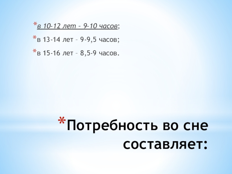 Потребность во сне составляет: в 10-12 лет – 9-10 часов;в 13-14 лет – 9-9,5 часов;в 15-16 лет