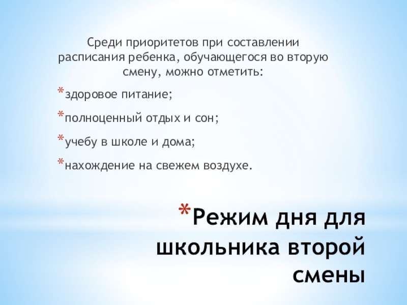 Режим дня для школьника второй сменыСреди приоритетов при составлении расписания ребенка, обучающегося во вторую смену, можно отметить:здоровое