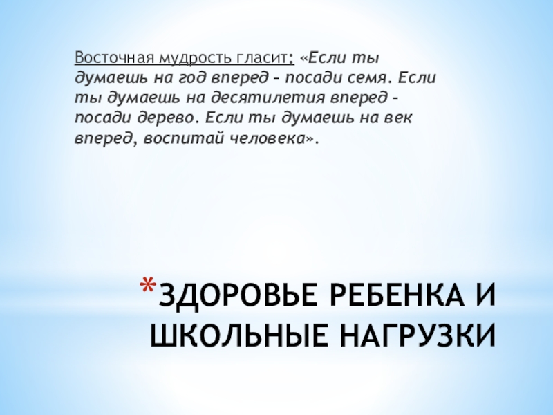 ЗДОРОВЬЕ РЕБЕНКА И ШКОЛЬНЫЕ НАГРУЗКИВосточная мудрость гласит: «Если ты думаешь на год вперед – посади семя. Если ты