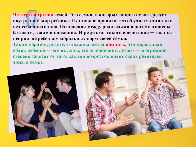 мир ребенка. Их главное правило: «чтоб учился отлично и вел себя прилично». Отношения между родителями и детьми лишены близости, взаимопонимания. И результат такого воспитания — полное неприятие ребенком моральных норм своей семьи.