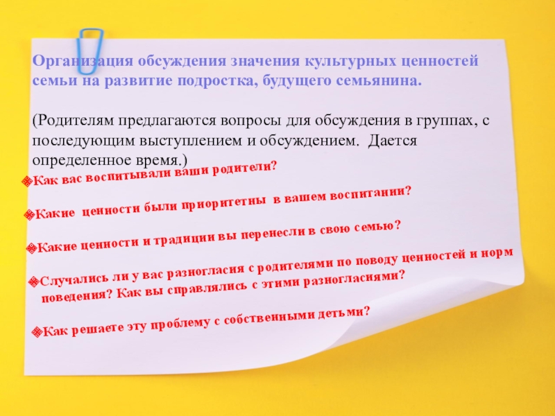 Слайд 9Организация обсуждения значения культурных ценностей семьи на развитие подростка, будущего семьянина.