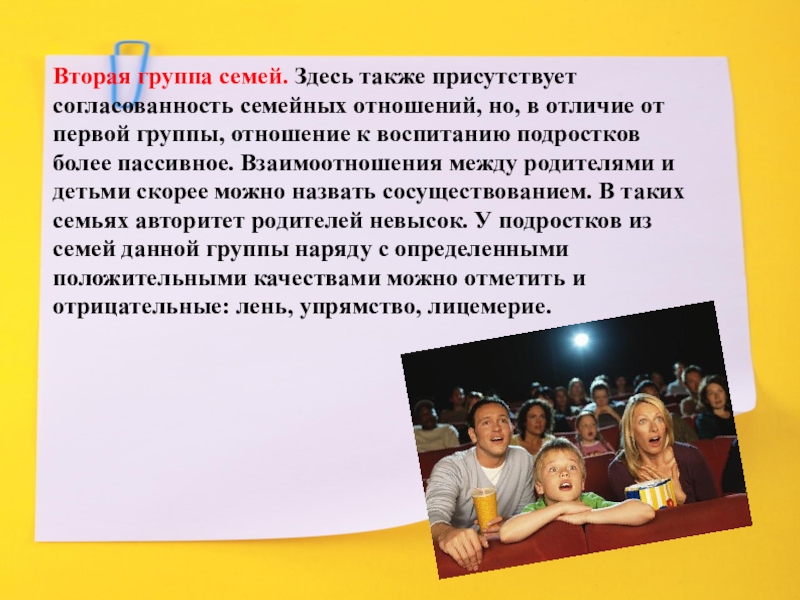 Слайд 11Вторая группа семей. Здесь также присутствует согласованность семейных отношений, но, в