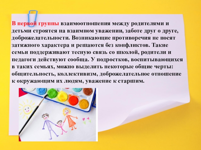 Слайд 10В первой группы взаимоотношения между родителями и детьми строятся на взаимном