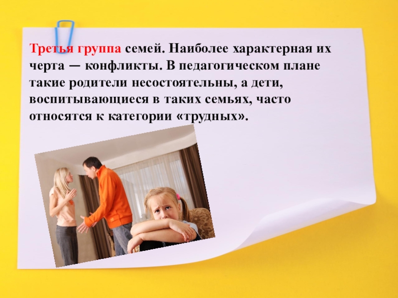 Слайд 12Третья группа семей. Наиболее характерная их черта — конфликты. В педагогическом