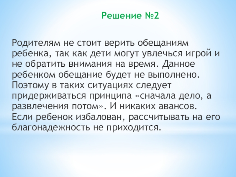 увлечься игрой и не обратить внимания на время. Данное ребенком обещание будет не выполнено. Поэтому в таких ситуациях следует придерживаться принципа «сначала дело, а развлечения потом». И никаких авансов. Если ребенок избалован, рассчитывать на его благонадежность не приходится.