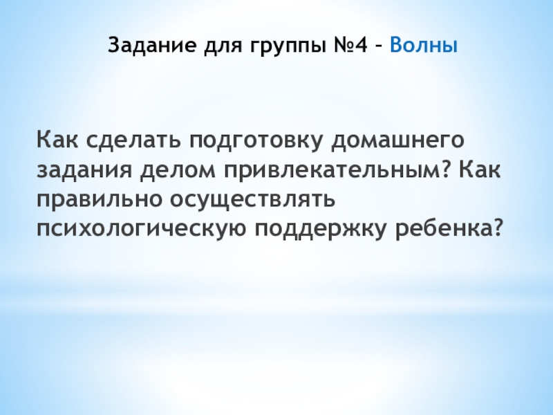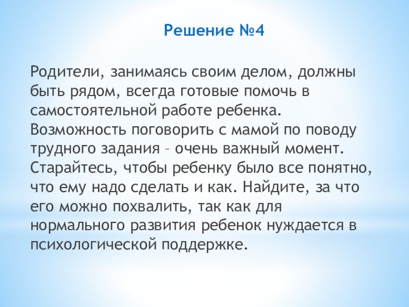 в самостоятельной работе ребенка. Возможность поговорить с мамой по поводу трудного задания – очень важный момент. Старайтесь, чтобы ребенку было все понятно, что ему надо сделать и как. Найдите, за что его можно похвалить, так как для нормального развития ребенок нуждается в психологической поддержке.
