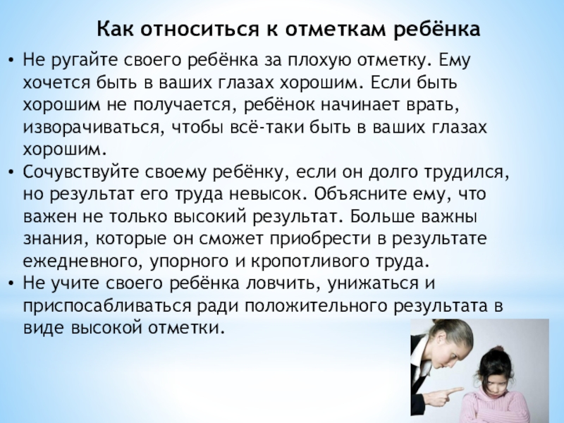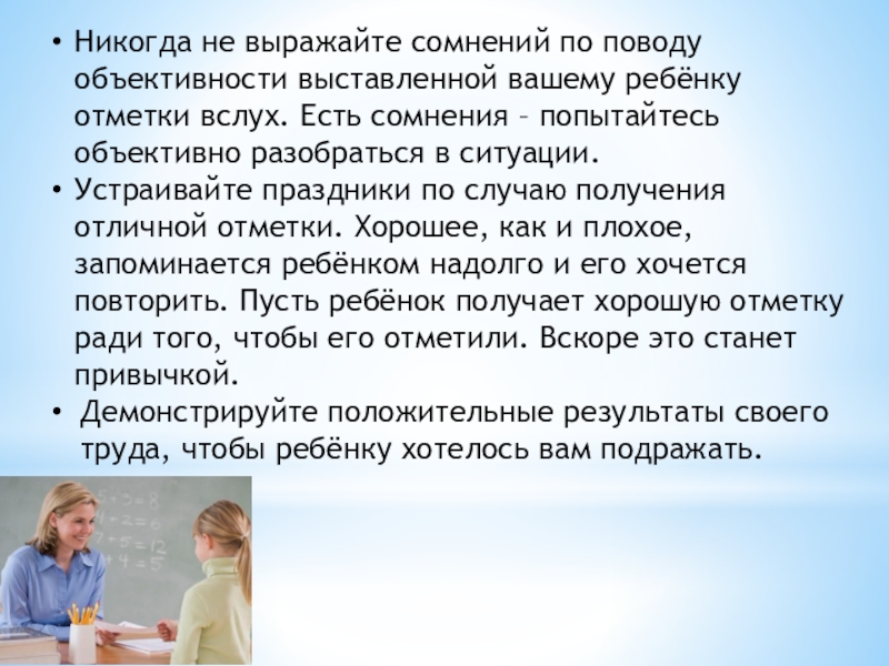 Слайд 20Никогда не выражайте сомнений по поводу объективности выставленной вашему ребёнку отметки
