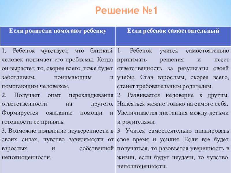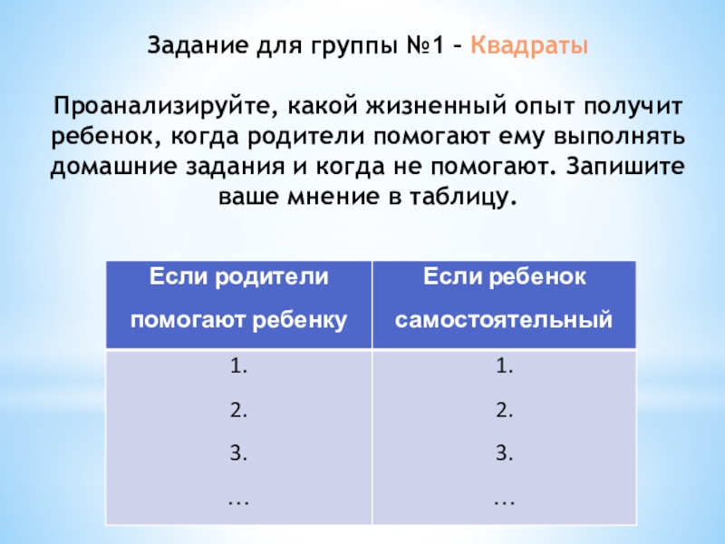 ребенок, когда родители помогают ему выполнять домашние задания и когда не помогают. Запишите ваше мнение в таблицу.