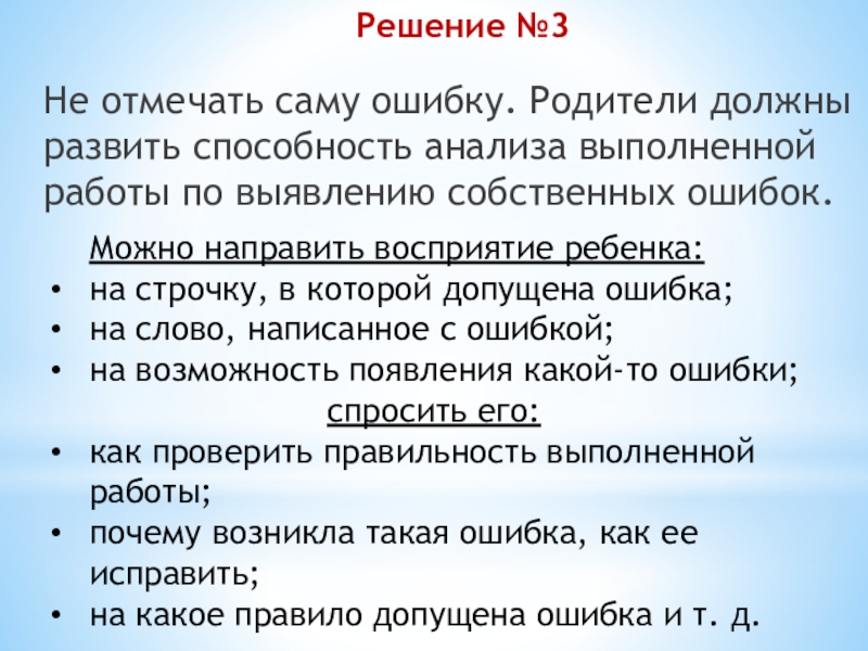 Не отмечать саму ошибку. Родители должны развить способность анализа выполненной
