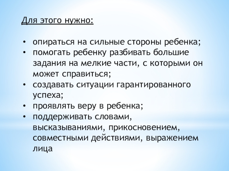 поддерживать словами, высказываниями, прикосновением, совместными действиями, выражением лица