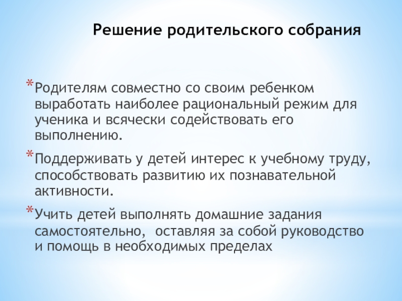 Родителям совместно со своим ребенком выработать наиболее рациональный режим