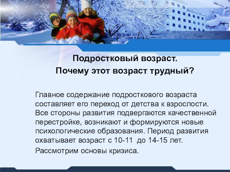 Подростковый возраст. Почему этот возраст трудный?   Главное содержание подросткового возраста составляет его переход от детства