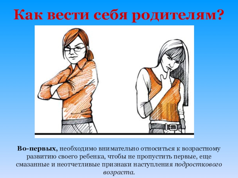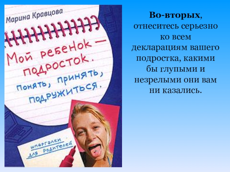 Слайд 14Во-вторых, отнеситесь серьезно ко всем декларациям вашего подростка, какими бы глупыми