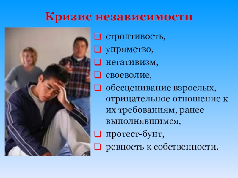 Кризис независимостистроптивость,упрямство,негативизм,своеволие,обесценивание взрослых, отрицательное отношение к их требованиям, ранее выполнявшимся, протест-бунт, ревность к собственности.