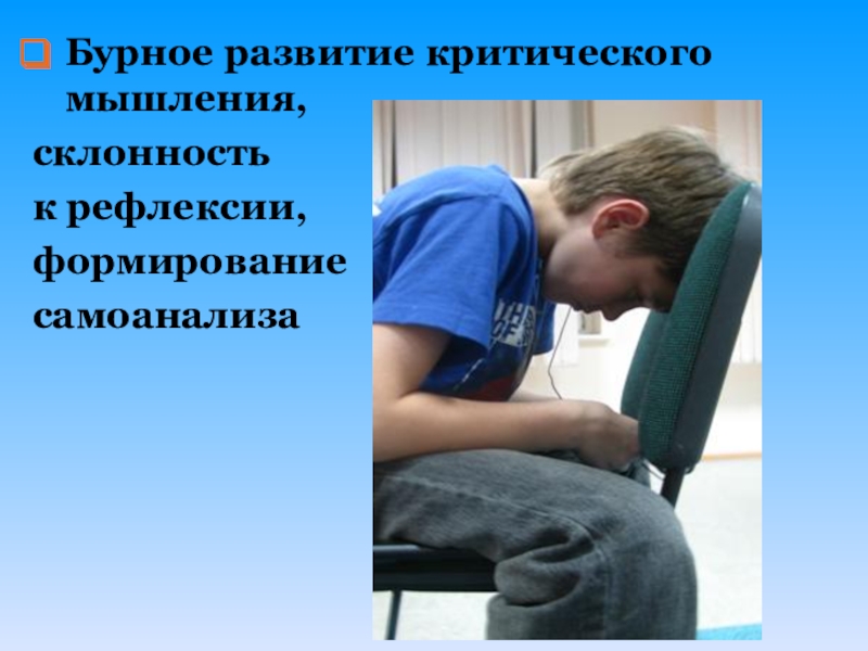 Бурное развитие критического мышления,склонность к рефлексии, формированиесамоанализа