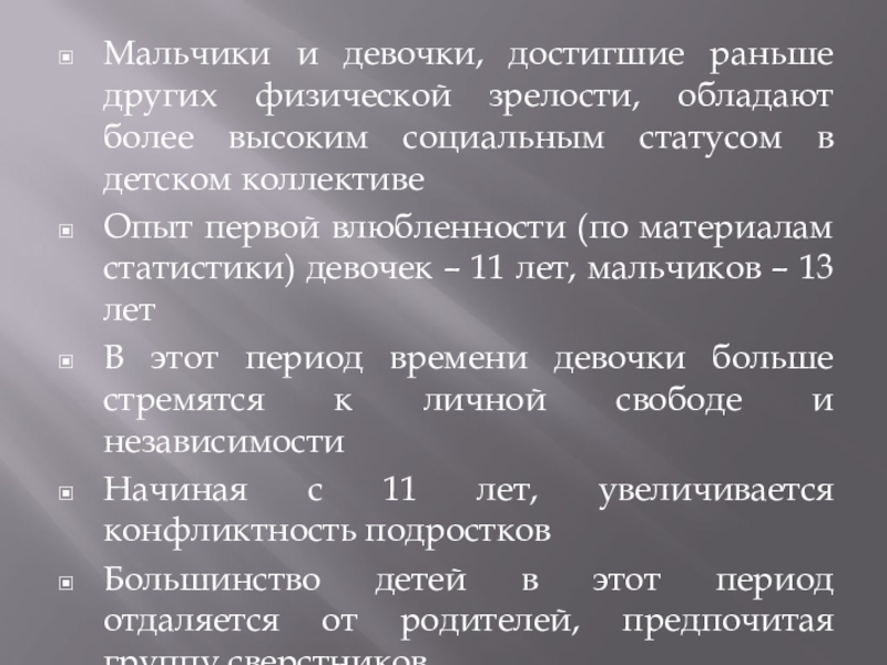 Слайд 3Мальчики и девочки, достигшие раньше других физической зрелости, обладают более высоким