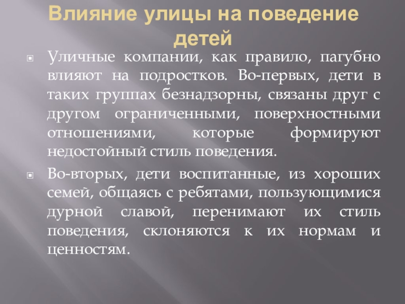 подростков. Во-первых, дети в таких группах безнадзорны, связаны друг с другом ограниченными, поверхностными отношениями, которые формируют недостойный стиль поведения.