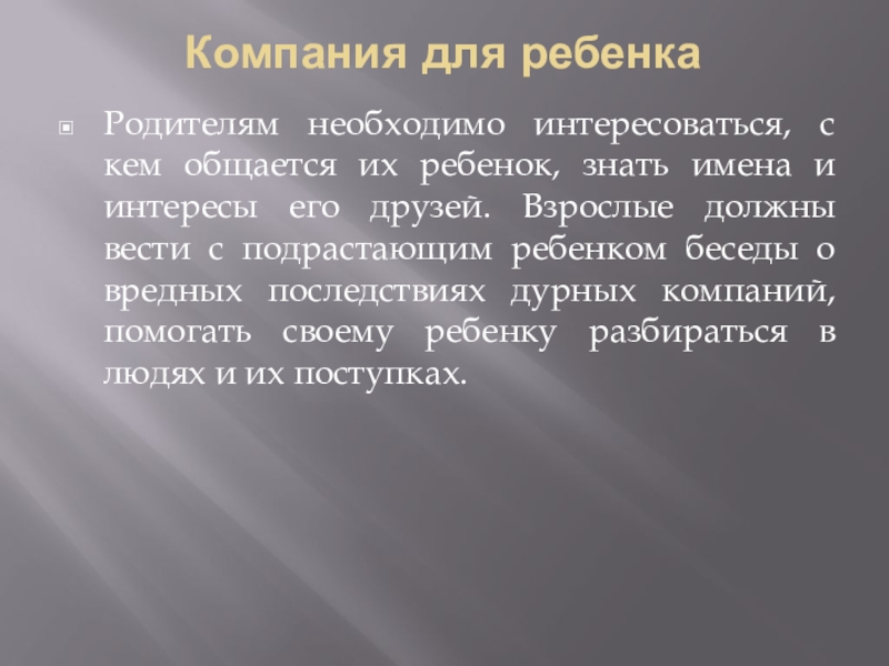 имена и интересы его друзей. Взрослые должны вести с подрастающим ребенком беседы о вредных последствиях дурных компаний, помогать своему ребенку разбираться в людях и их поступках.