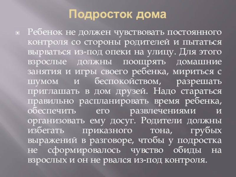 пытаться вырваться из-под опеки на улицу. Для этого взрослые должны поощрять домашние занятия и игры своего ребенка, мириться с шумом и беспокойством, разрешать приглашать в дом друзей. Надо стараться правильно распланировать время ребенка, обеспечить его развлечениями и организовать ему досуг. Родители должны избегать приказного тона, грубых выражений в разговоре, чтобы у подростка не сформировалось чувство обиды на взрослых и он не рвался из-под контроля.