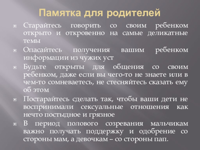 Постарайтесь сделать так, чтобы ваши дети не воспринимали сексуальные отношения как нечто постыдное и грязное
