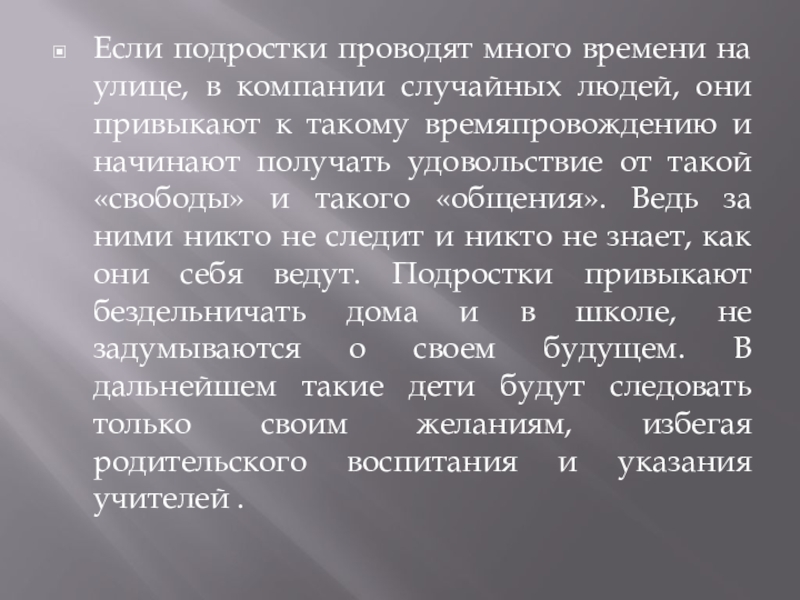 они привыкают к такому времяпровождению и начинают получать удовольствие от такой «свободы» и такого «общения». Ведь за ними никто не следит и никто не знает, как они себя ведут. Подростки привыкают бездельничать дома и в школе, не задумываются о своем будущем. В дальнейшем такие дети будут следовать только своим желаниям, избегая родительского воспитания и указания учителей .