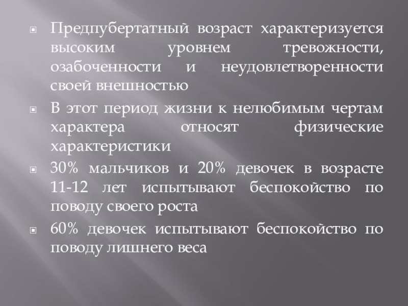 Слайд 2Предпубертатный возраст характеризуется высоким уровнем тревожности, озабоченности и неудовлетворенности своей внешностью