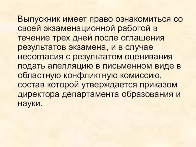 течение трех дней после оглашения результатов экзамена, и в случае несогласия с результатом оценивания подать апелляцию в письменном виде в областную конфликтную комиссию, состав которой утверждается приказом директора департамента образования и науки.