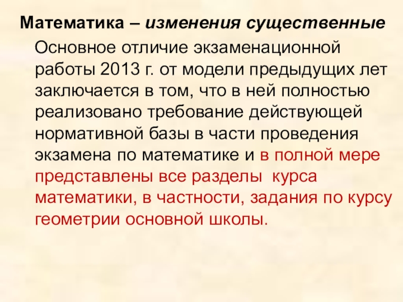 г. от модели предыдущих лет заключается в том, что в ней полностью реализовано требование действующей нормативной базы в части проведения экзамена по математике и в полной мере представлены все разделы курса математики, в частности, задания по курсу геометрии основной школы.