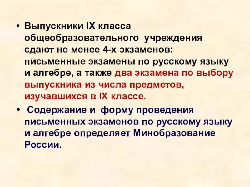 Содержание и форму проведения письменных экзаменов по русскому языку и алгебре определяет Минобразование России.
