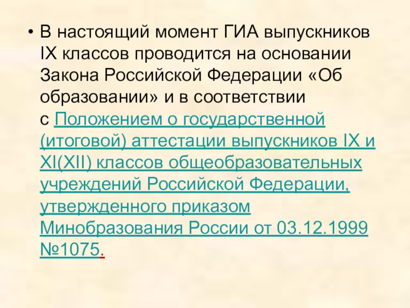 Слайд 4В настоящий момент ГИА выпускников IX классов проводится на основании Закона