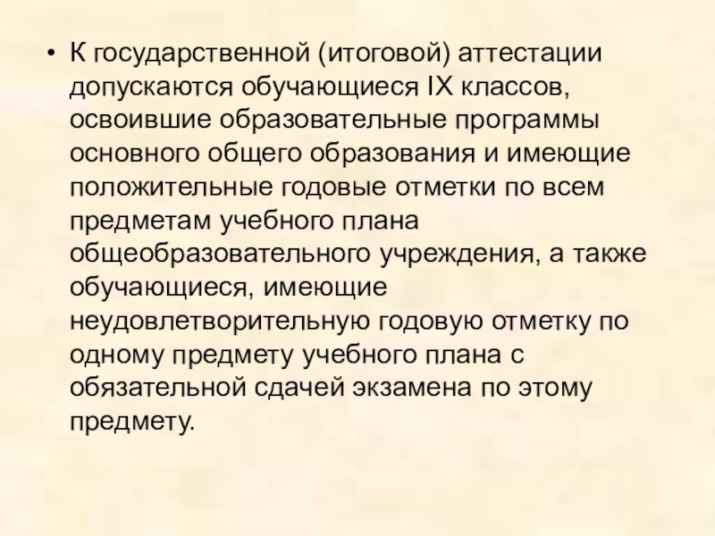 Слайд 6К государственной (итоговой) аттестации допускаются обучающиеся IX классов, освоившие образовательные программы