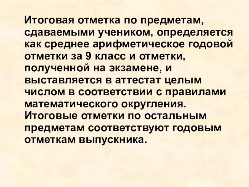арифметическое годовой отметки за 9 класс и отметки, полученной на экзамене, и выставляется в аттестат целым числом в соответствии с правилами математического округления. Итоговые отметки по остальным предметам соответствуют годовым отметкам выпускника.